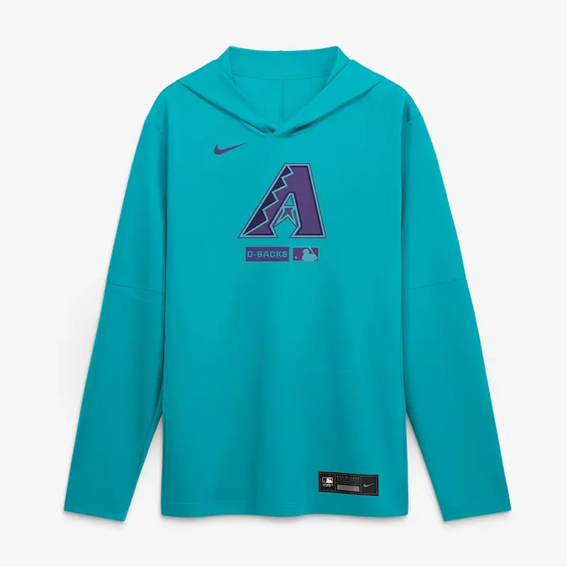 Mens Arizona Diamondbacks Nike Aqua City Connect Dri-FIT Long Sleeve Hooded T-Shirt delivers Arizona Diamondbacks-inspired style, aqua colorway, City Connect graphics in a versatile long sleeve hooded T-shirt built for men fans, training days, and casual wear.