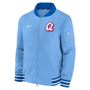Mens Atlanta Braves Nike Light Blue Full-Zip Bomber Jacket delivers Atlanta Braves-inspired style, light blue colorway, everyday comfort in a versatile full-zip bomber jacket built for men fans, training days, and casual wear.